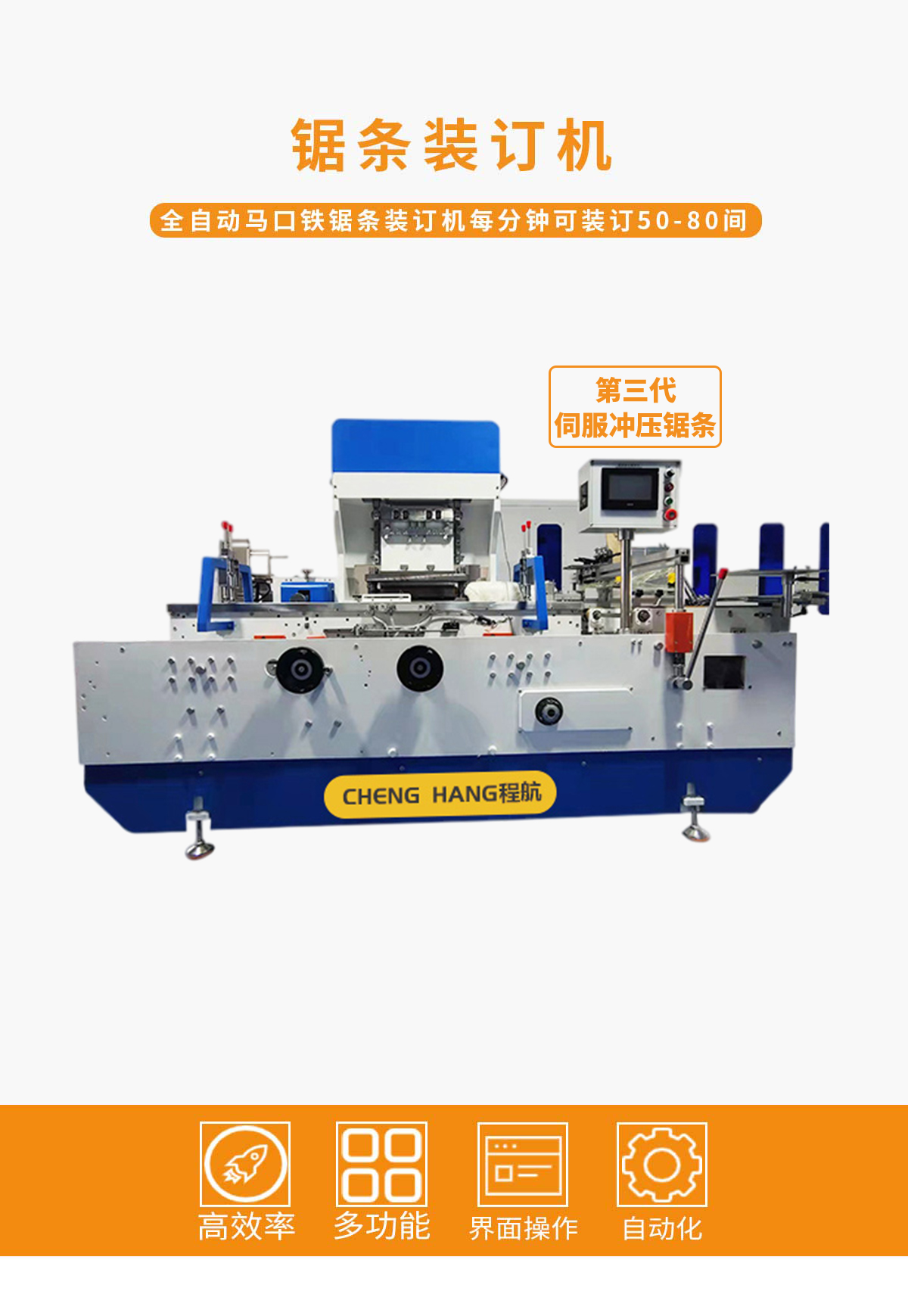 锯条自动装订机分为:分纸送纸机构,自动输送定位机,液压冲压装置,模具自动冲切装订组件,马口铁自动送料机构。设备适用于保鲜膜行业,马口铁锯条装订与塑料锯条涂胶贴合工艺的自动化生产。