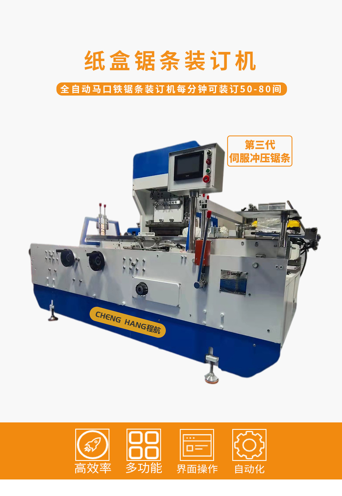 锯条全自动装订机,用模具将卷状原料(马口铁)冲切成锯条产品,并同时将锯条装订在保鲜膜纸盒要求的位置上。