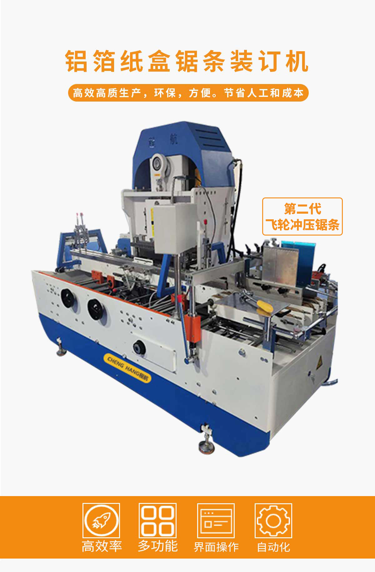 锯条自动装订机分为:分纸送纸机构,自动输送定位机,液压冲压装置,模具自动冲切装订组件,马口铁自动送料机构。设备适用于保鲜膜行业,马口铁锯条装订与塑料锯条涂胶贴合工艺的自动化生产。