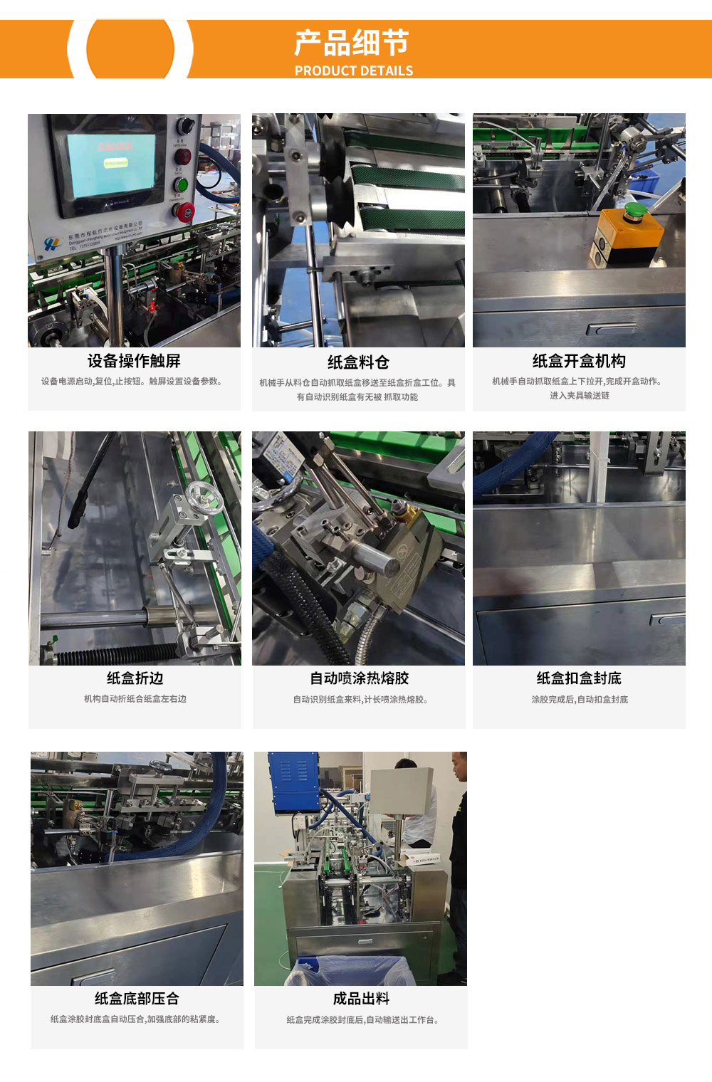 1,集开盒、装料、折盒、喷胶、封盒为一体,配有国内先进的全自动高速双喷枪热熔胶机。